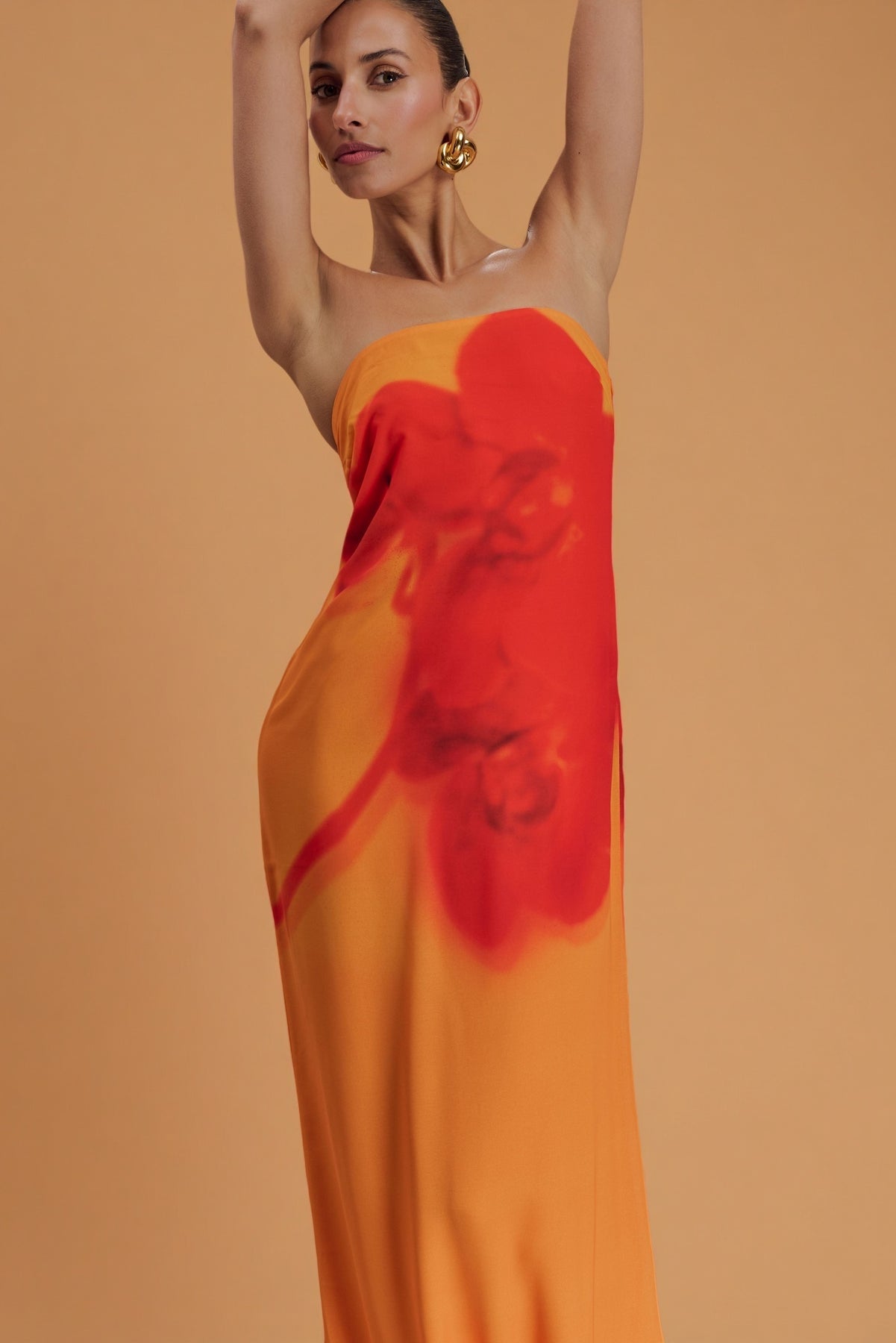 Son orange éclatant, rehaussé de touches rouges intenses, évoque le coucher du soleil — pour une allure affirmée, féminine et estivale.