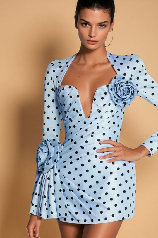 Son tissu bleu orné de motifs à pois et fleurs apporte une touche ludique et féminine, sublimée par de jolis détails froncés.