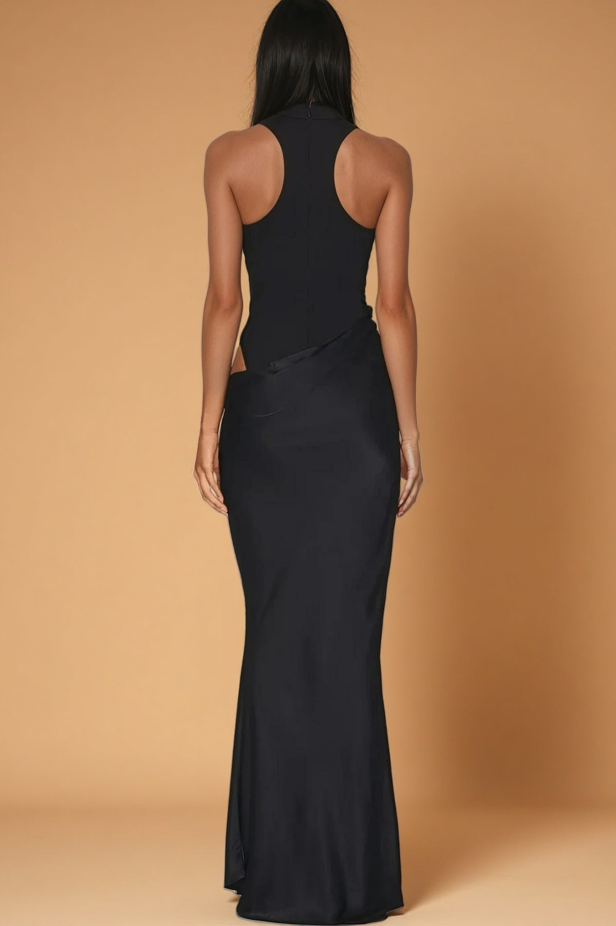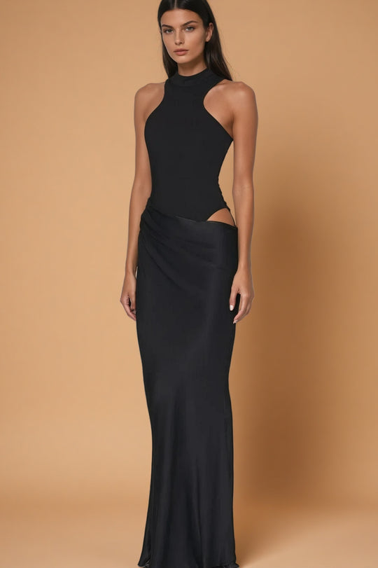 Ajoutez une touche de sophistication à votre garde-robe avec la robe longue en satin Beres – coloris noir.