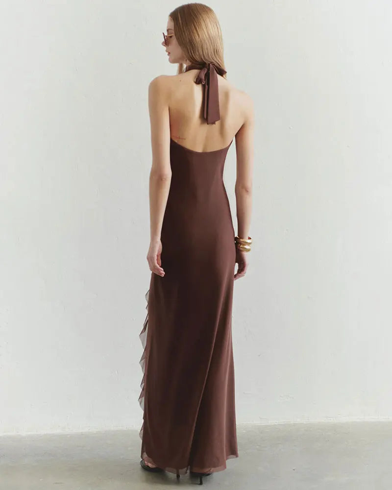 Faites rayonner votre style avec la robe Soleil d’Or, une pièce longue et raffinée ornée de superbes volants. Sa coupe fluide et sa matière légère valorisent la silhouette, tandis que son décolleté noué derrière la nuque sublime les épaules. Disponible en deux teintes lumineuses :
